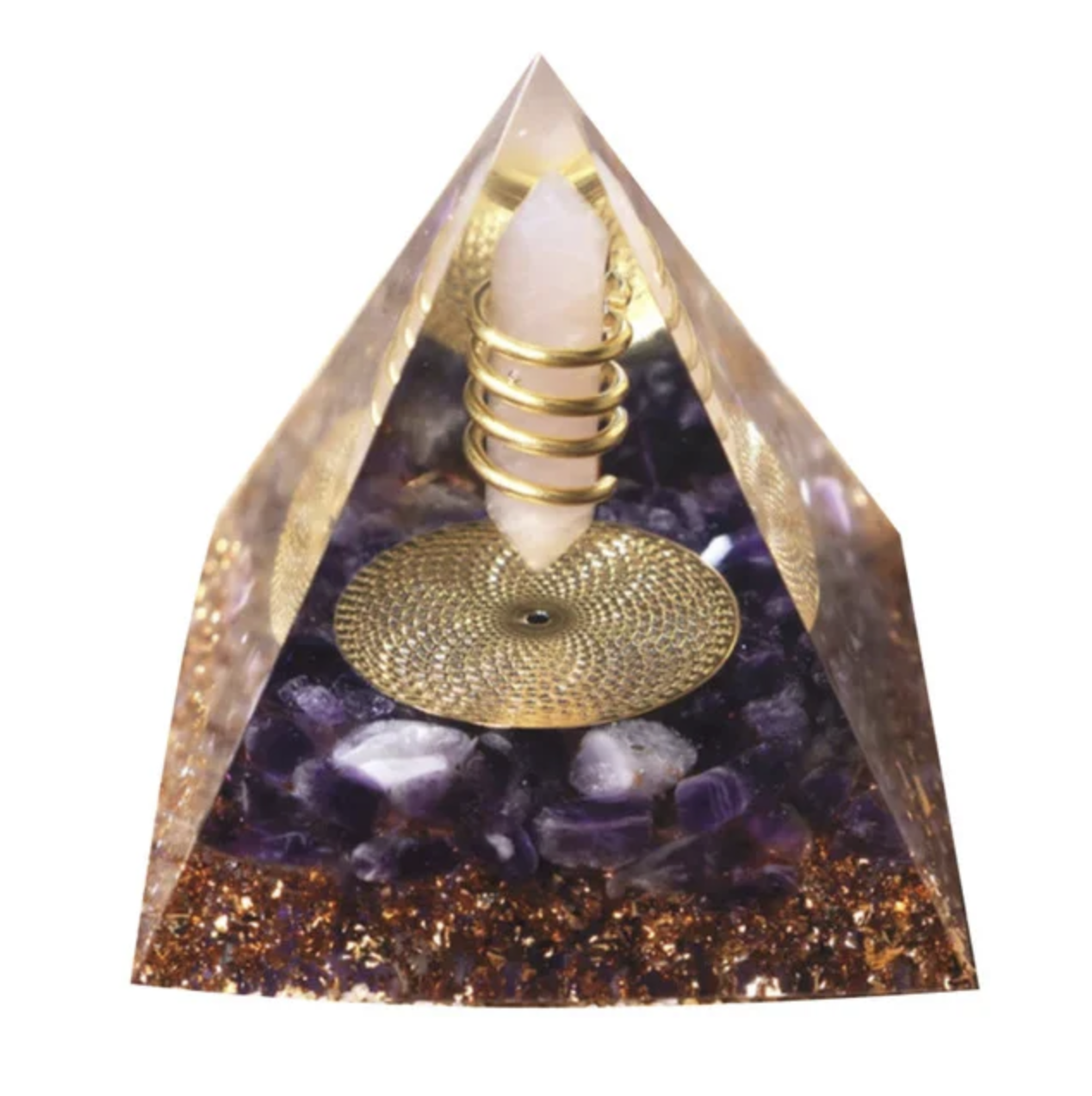Deze prachtige Orgoniet piramide met amethist, rozenkwarts en koper spiraal is een krachtig symbool van balans en energie. De piramide is zorgvuldig gegoten in orgoniet, een materiaal dat bekend staat om zijn vermogen om energie te transformeren. De amethist stenen helpen bij het bevorderen van innerlijke rust en het verminderen van stress, terwijl de rozenkwarts pegel liefde en harmonie brengt. De koper spiraal in het midden versterkt de energiestromen en helpt bij het bevorderen van een positieve aura.