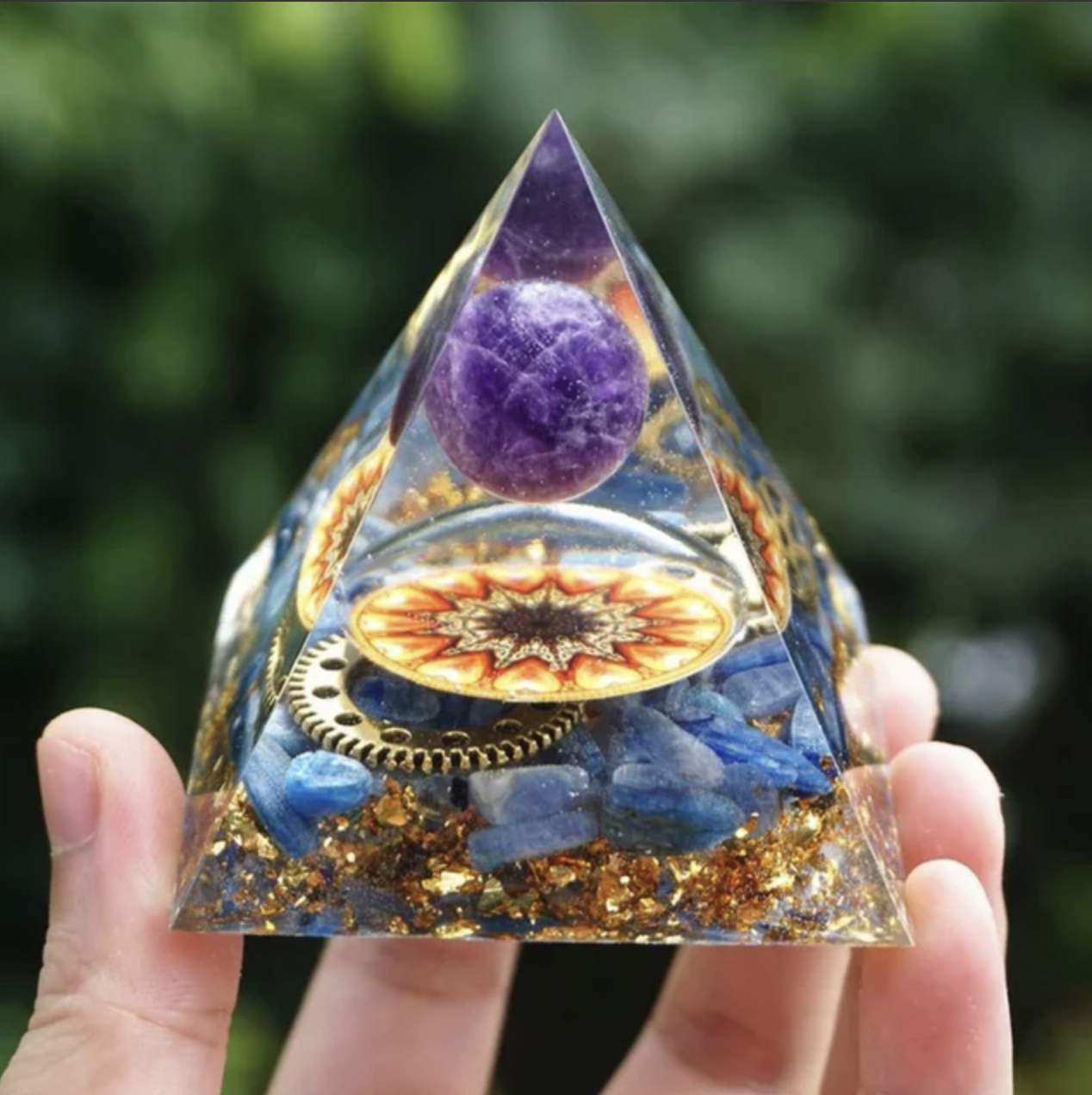 Deze Orgoniet piramide met lapis lazuli en amethist is een prachtig krachtig object voor het zuiveren en verhogen van energie. De piramide is gevuld met amethist kristallen, bekend om hun vermogen om de geest te kalmeren en spirituele energieën te versterken. De lapis lazuli, die bekend staat om zijn diepe blauwe kleur, wordt vaak geassocieerd met het openen van de derde oog chakra en het bevorderen van innerlijke wijsheid en helderheid.