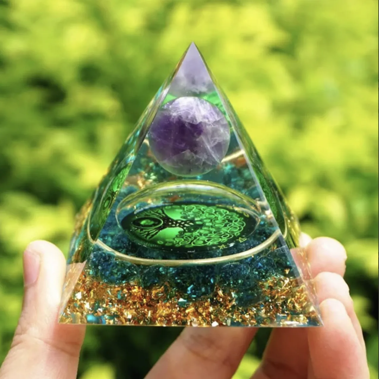 Deze Orgoniet piramide met een levensboom en amethist is een prachtig stuk dat energie versterkt en een rustige, harmonieuze sfeer creëert. De piramide is zorgvuldig ontworpen met een amethistkristal bovenin, dat bekend staat om zijn kalmerende eigenschappen. De levensboom in het midden staat symbool voor groei, vitaliteit en het universum, terwijl de gouden spiraal aan de basis de energie bevordert en balans brengt.