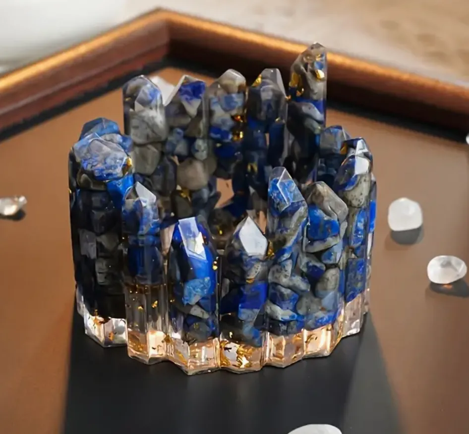 De Lapis Lazuli Kaarshouder in kristalvorm is een sfeervol en decoratief object waarin natuurlijke elementen en een glanzende afwerking samenkomen. De houder is opgebouwd uit kleine lapis lazuli steentjes die zijn ingebed in heldere hars. De diepe blauwe tinten van de steen, met soms een vleugje wit of goud, geven het geheel een rijke uitstraling.