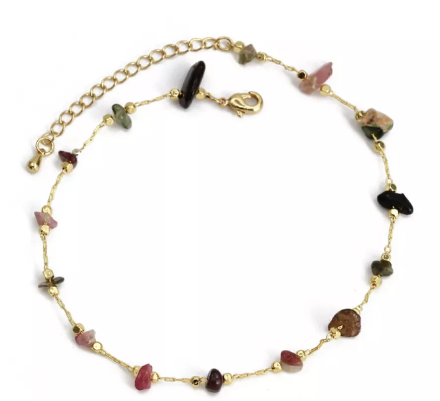 Deze enkelband toermalijn goudkleurig is een prachtig sieraad dat luxe en natuur samenbrengt. De combinatie van de warme goudkleurige schakels en de ruwe toermalijnkralen zorgt voor een elegant contrast tussen verfijning en de ongerepte schoonheid van edelstenen. De natuurlijke tinten van toermalijn geven de enkelband een authentieke uitstraling die perfect past bij zowel bohemian als klassieke stijlen.