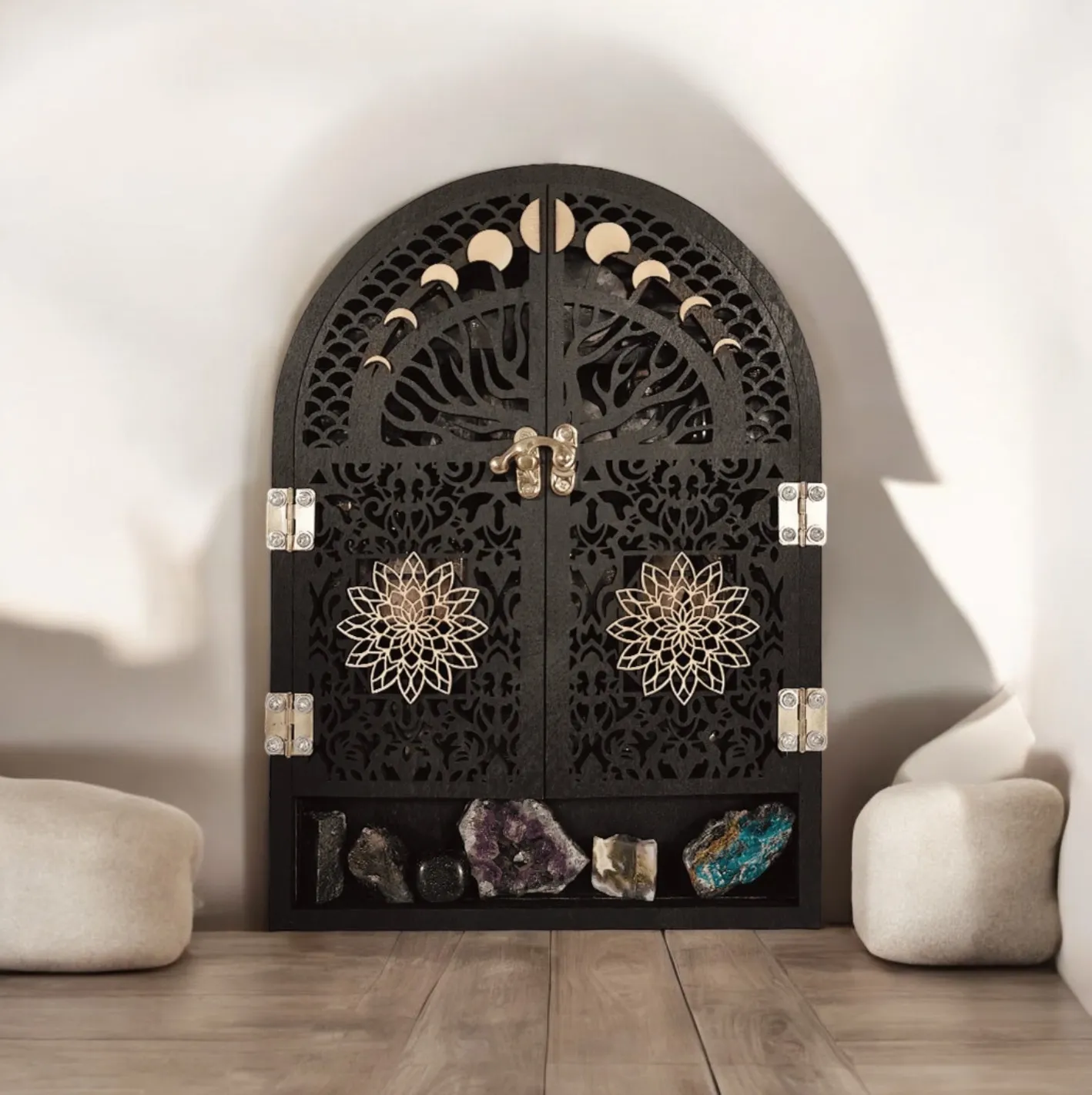 Creëer een persoonlijk heiligdom in je huis met dit prachtige edelsteen altaar. Met een hoogte van 30 cm en een breedte van 21,4 cm biedt dit altaar een perfecte ruimte om je favoriete edelstenen, kristallen en spirituele objecten te bewaren en tentoon te stellen. Het elegante ontwerp met dubbele deuren en fijne patronen voegt een vleugje mystiek toe aan elke ruimte, terwijl het de energie van je heilige voorwerpen beschermt en versterkt.