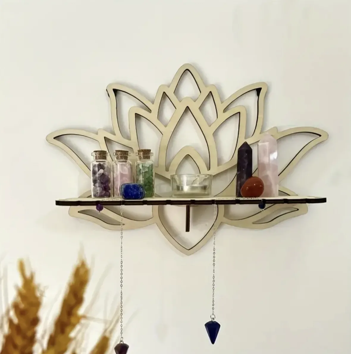Voeg artistieke elegantie toe aan je interieur met onze Elegante Bohemien Houten Wandplank voor Lotusbloem. Deze prachtige wandplank is een verfijnde mix van kunst en functionaliteit, ontworpen met een open lotusontwerp dat symbool staat voor rust, balans en spirituele groei. Handgemaakt van hoogwaardig, duurzaam hout, is deze plank perfect voor het tentoonstellen van kristallen, kaarsen of essentiële olieflessen, en vormt het een stijlvolle aanvulling op je meditatie- of yogaruimte.