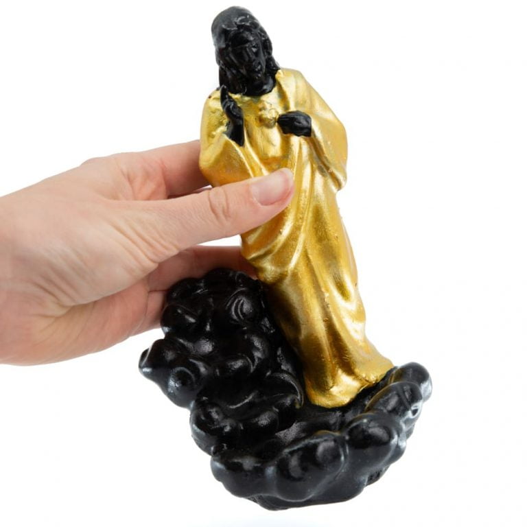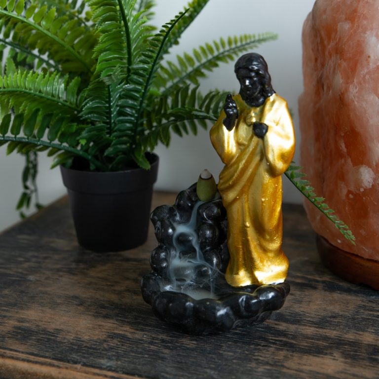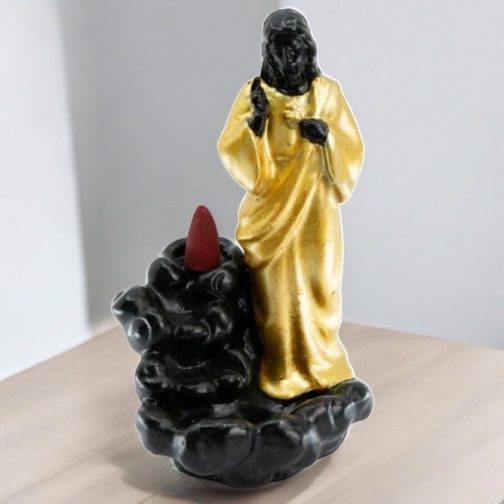 De Wierook Houder Jezus is een indrukwekkende backflow wierookbrander die niet alleen een functioneel object is, maar ook een spiritueel symbool van rust en bescherming. Het ontwerp van deze brander toont Jezus op een waterval (wolk), waar de rook op een betoverende manier naar beneden valt, in plaats van omhoog te stijgen. Dit creëert een uniek visueel effect dat je ruimte voorziet van een rustige en contemplatieve sfeer.