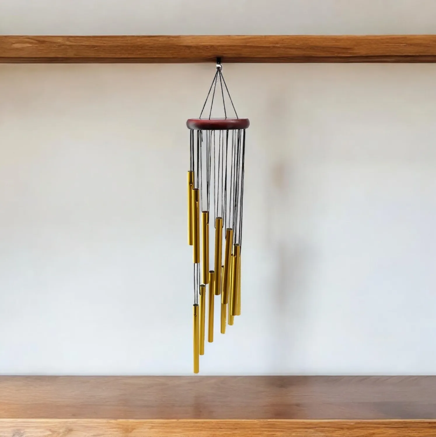 Deze is met zorg ontworpen om zowel esthetisch aantrekkelijk als functioneel te zijn. Gemaakt van hoogwaardig aluminium met een elegante goudkleurige afwerking en natuurlijke houten elementen, creëert deze windgong een warme, uitnodigende sfeer. Het stijlvolle design zorgt ervoor dat de windgong een visueel en auditief statement maakt in elke ruimte. De harmonieus resonerende klanken worden versterkt door de precisie en kwaliteit van de gebruikte materialen.