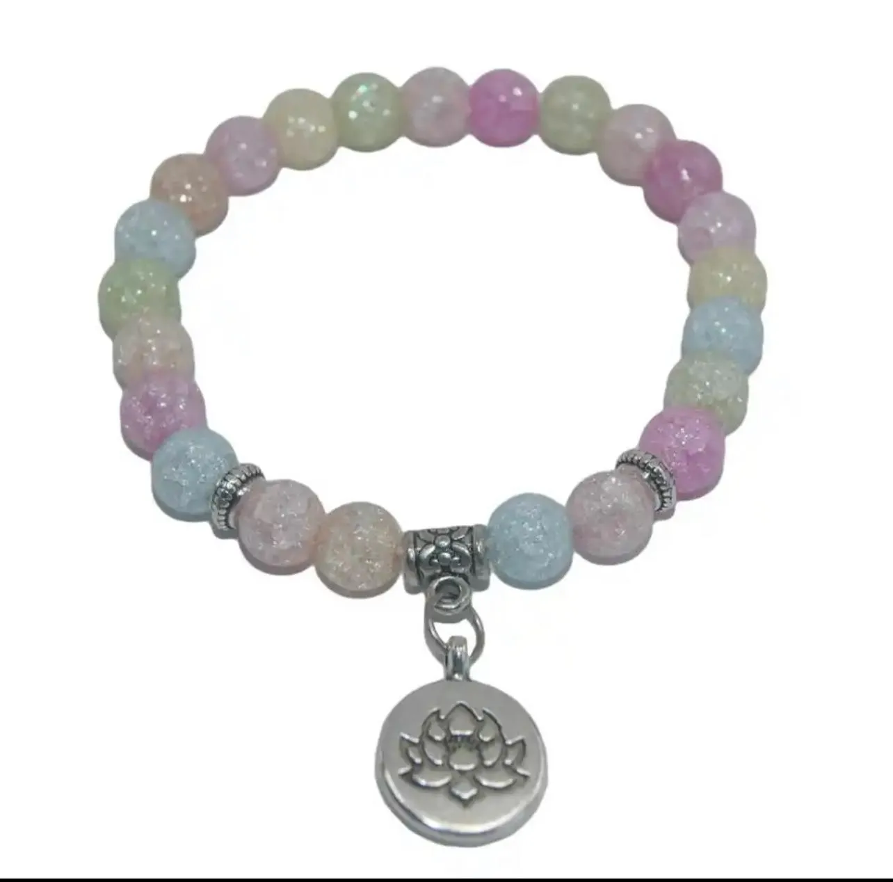 Deze prachtige kralen armband is gemaakt van gekleurde glas kralen en een lotus bedel. De kralen zijn gemaakt van glas en hebben een glanzende afwerking. De lotus bedel is gemaakt van metaal en heeft een gouden of zilveren afwerking.