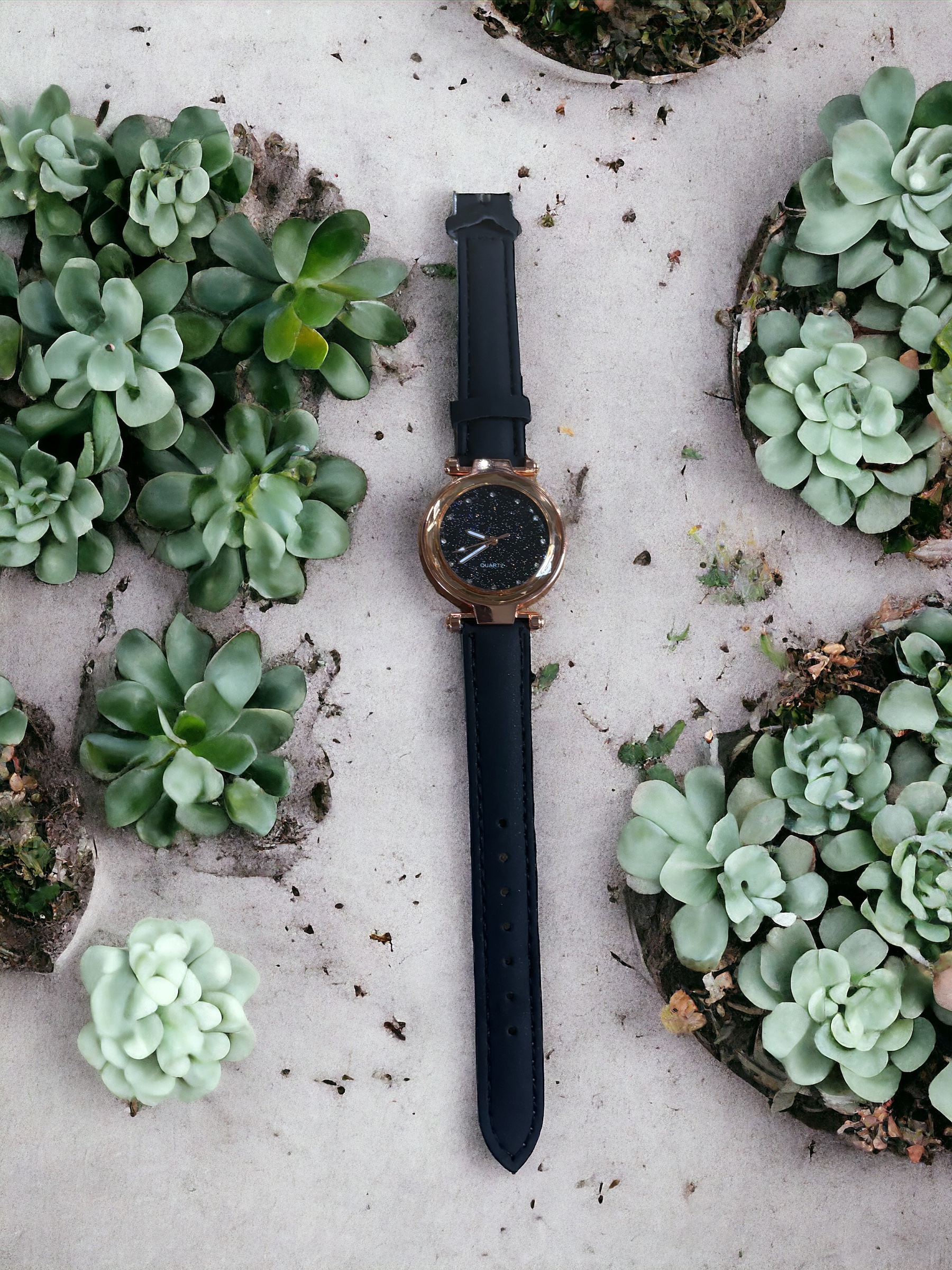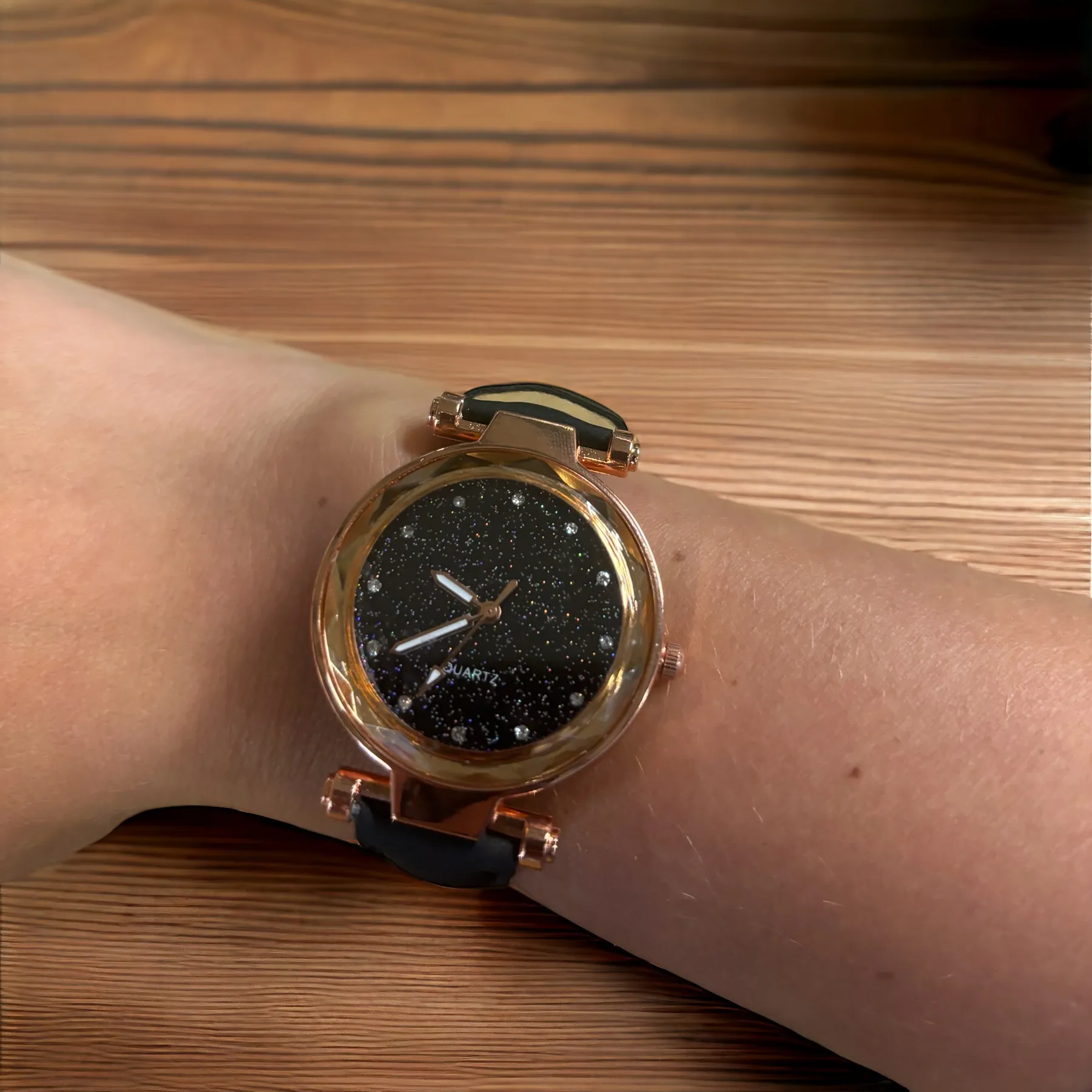 Laat jezelf betoveren door de magie van het leven. Voel de oneindige mogelijkheden die elk moment met zich meebrengt en laat je inspireren door de schittering van het nu. Laat dit fonkelende zwarte horloge je gids zijn op je spirituele reis. Bestel vandaag nog en draag de tijdloze magie van het universum om je pols.