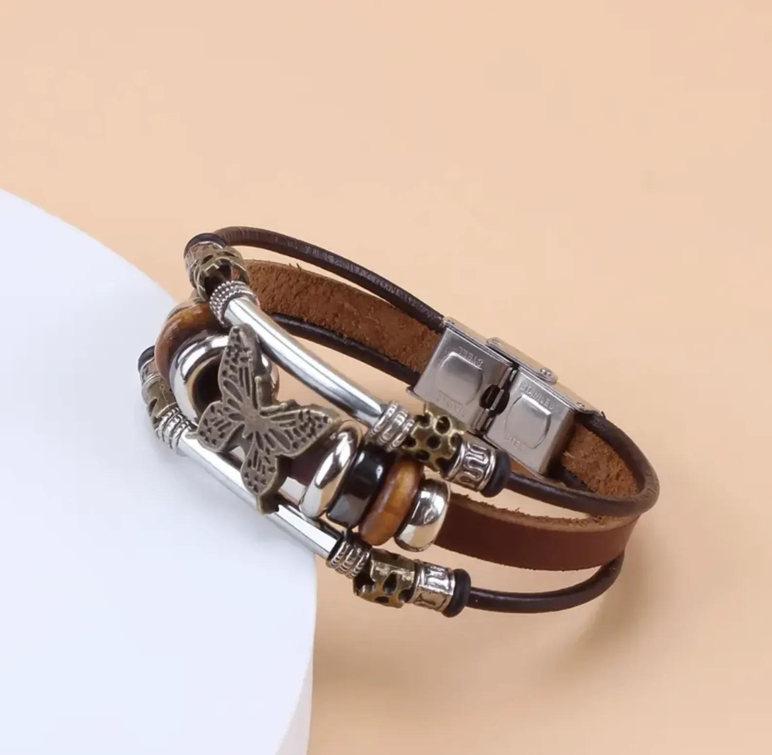 De stevige leren band van de armband zorgt voor comfort en duurzaamheid, terwijl de roestvrijstalen sluiting zorgt voor een veilige en gemakkelijke sluiting. Het slijtvaste leer en de stevige sluiting maken deze armband geschikt voor dagelijks gebruik, terwijl het vlinderontwerp een subtiele hint geeft van vrijheid en verandering. Het is een prachtig accessoire voor iedereen die van een vintage stijl houdt en tegelijkertijd een moderne touch aan hun look wil toevoegen.